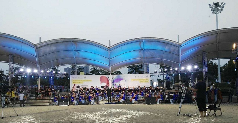 傍晚,在西海岸新區(qū)的城市陽臺景區(qū),游客和市民穿著T恤,正喝著冰鎮(zhèn)飲料,在沙灘享受涼爽的海風(fēng)。在景區(qū)沙灘排球場,歐盟青年音樂節(jié)聯(lián)盟組委會的工作人員正在熱火朝天地完成演出場地的最后搭建和音響調(diào)試,市民們紛紛投來好奇的眼光,直到第一個樂團上臺,悅耳的音樂聲響起,舞臺的周圍迅速聚攏了大量的游客和市民。